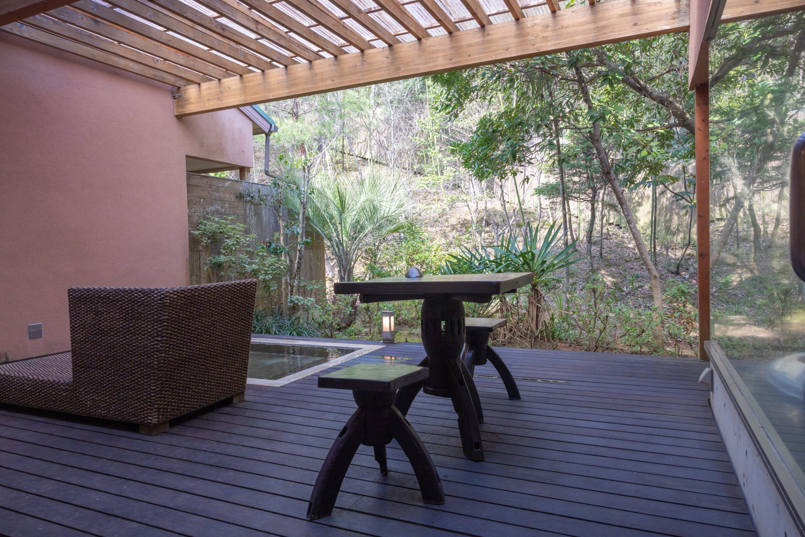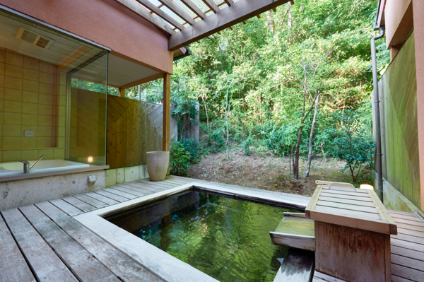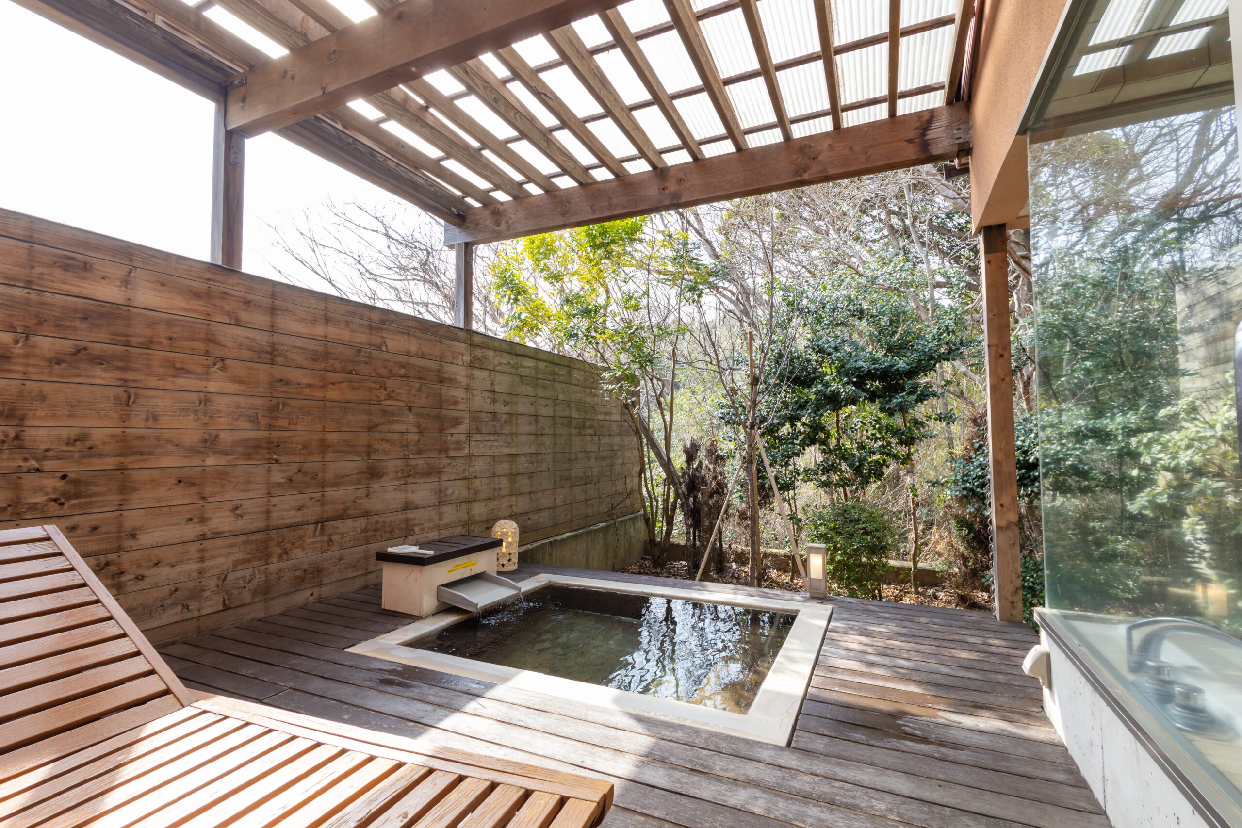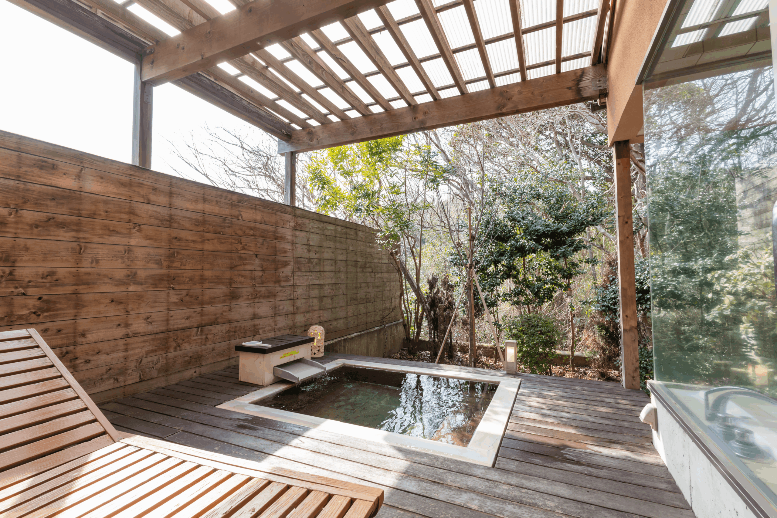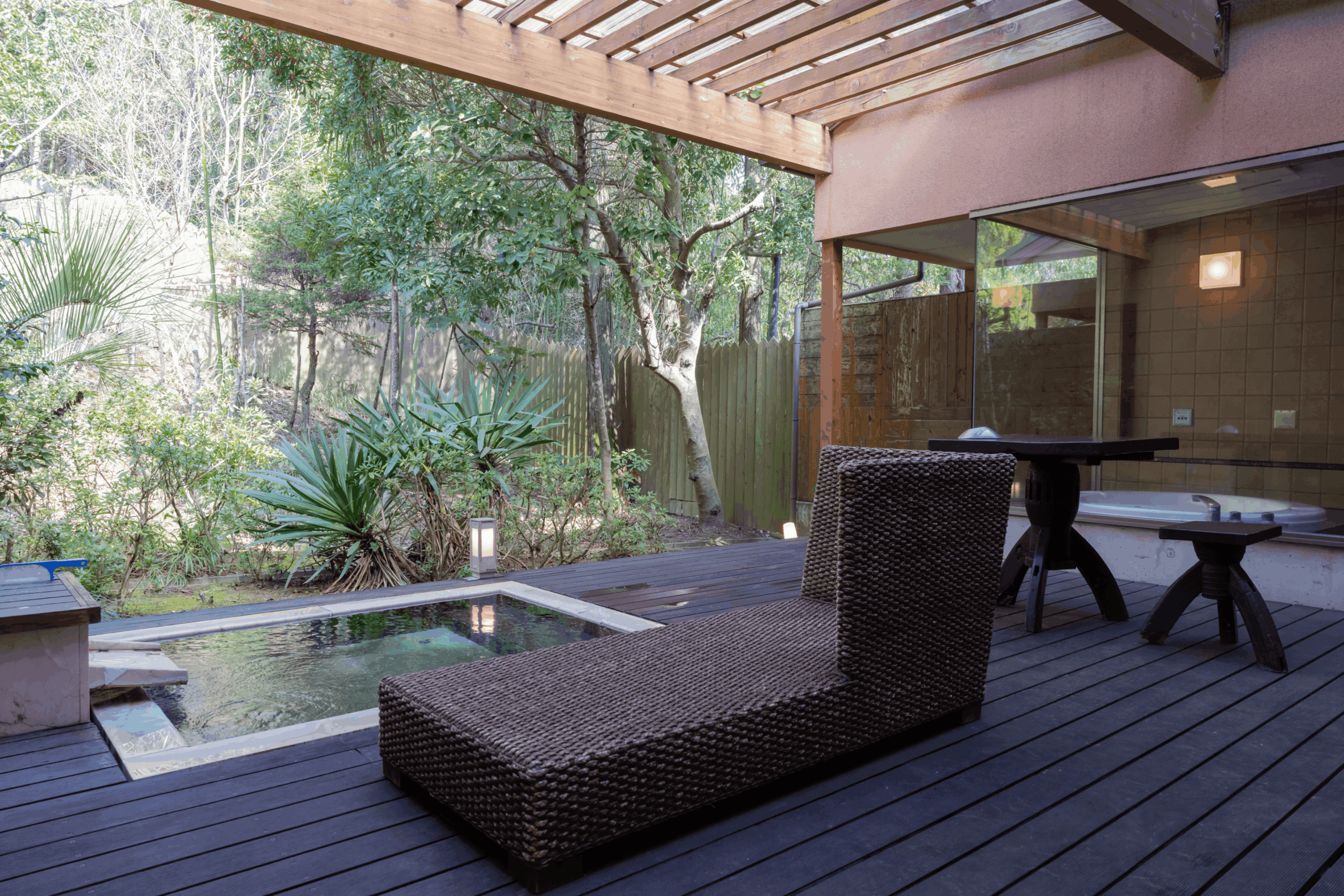 広々とした専用テラスデッキには、開放感あふれる露天風呂と大型ジャグジーを完備。