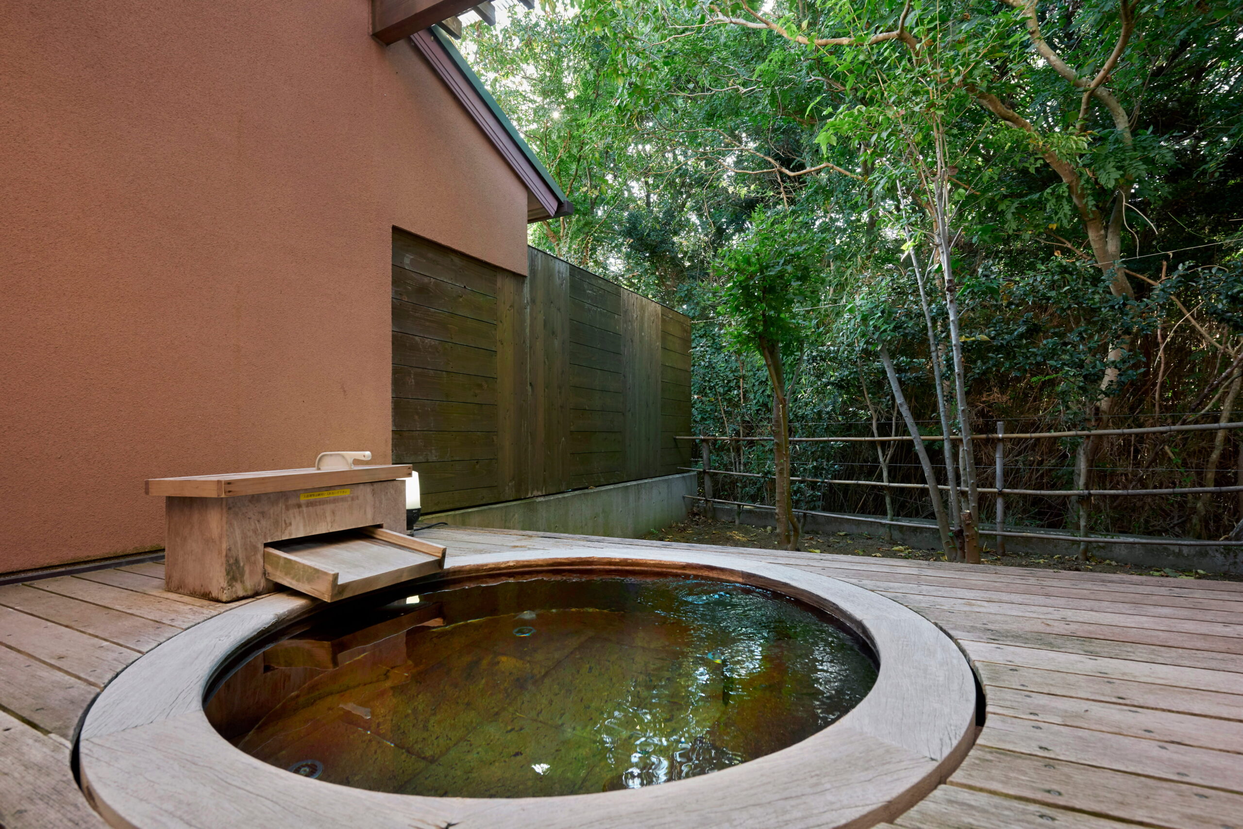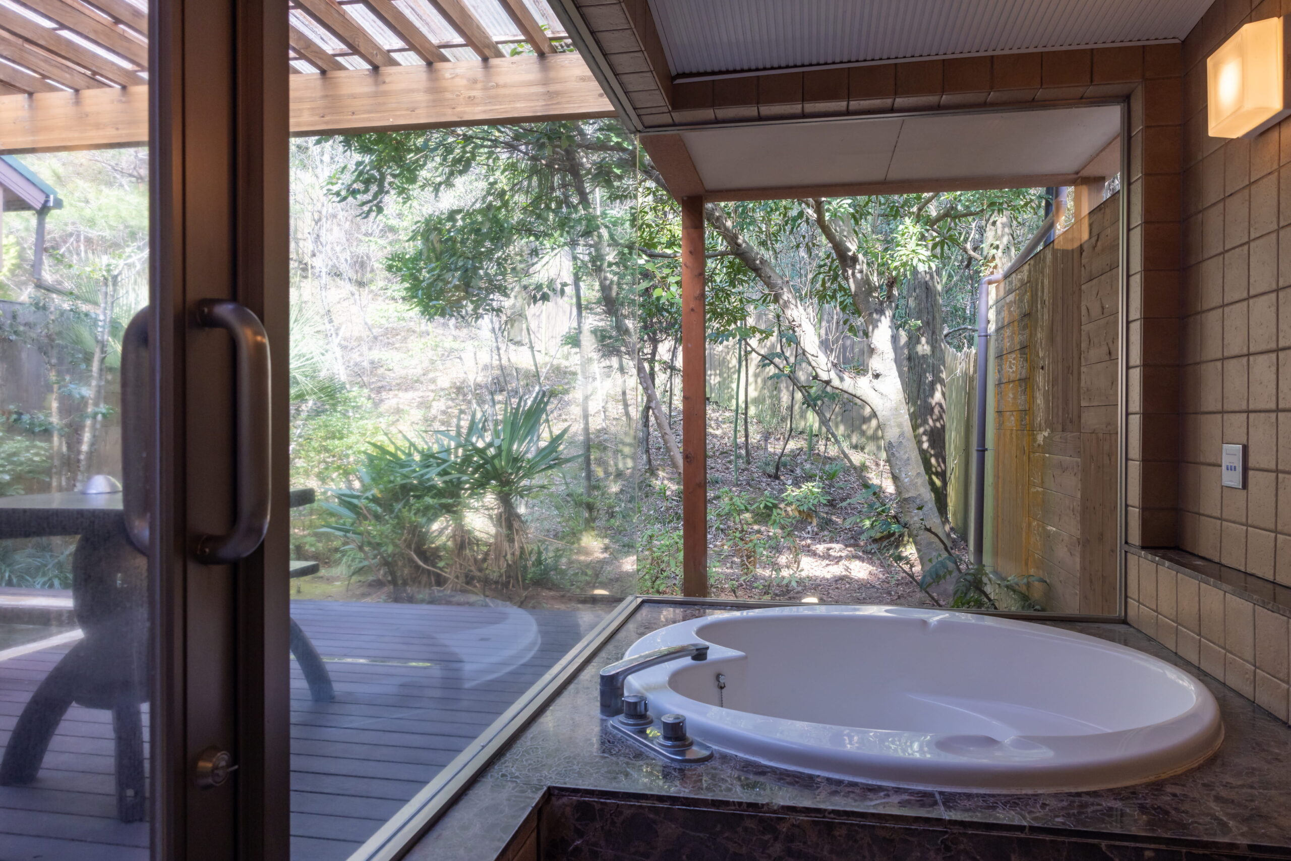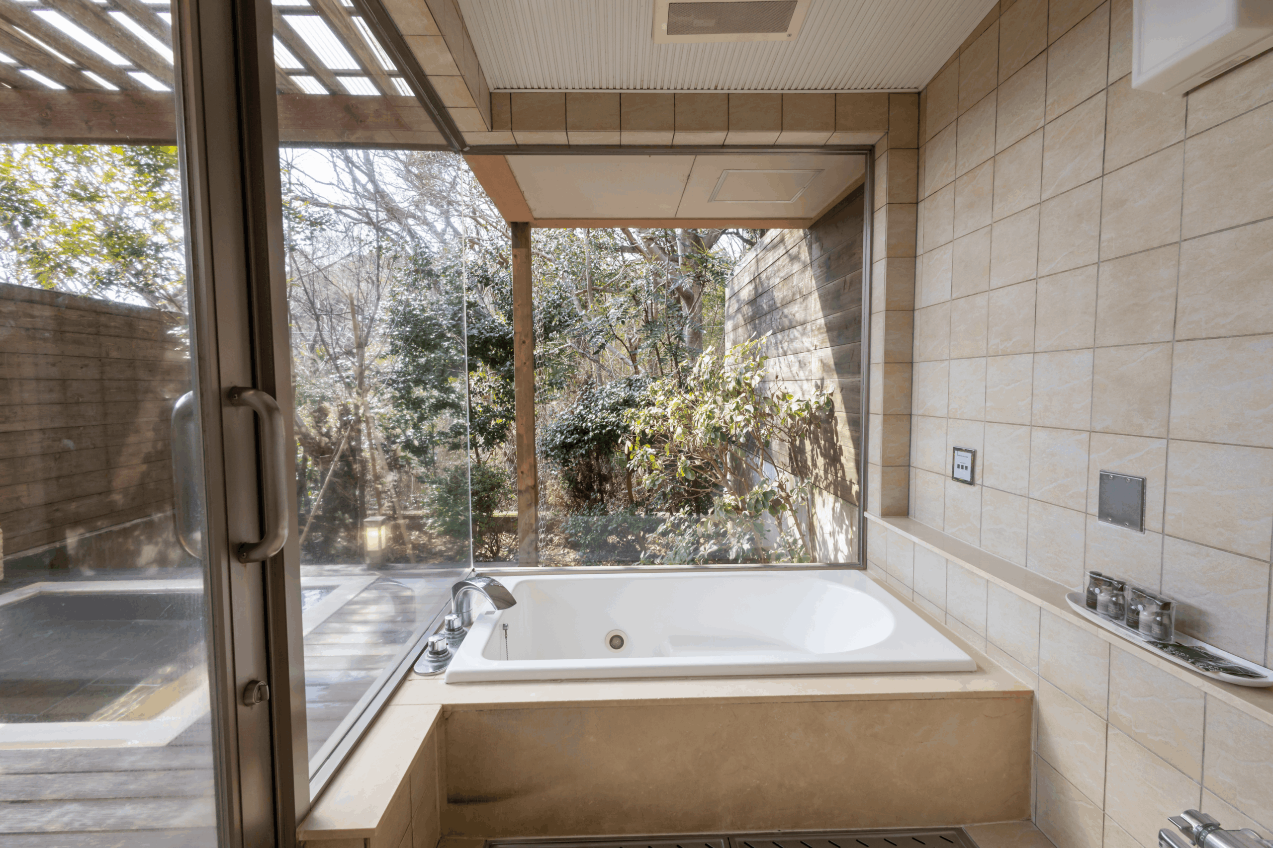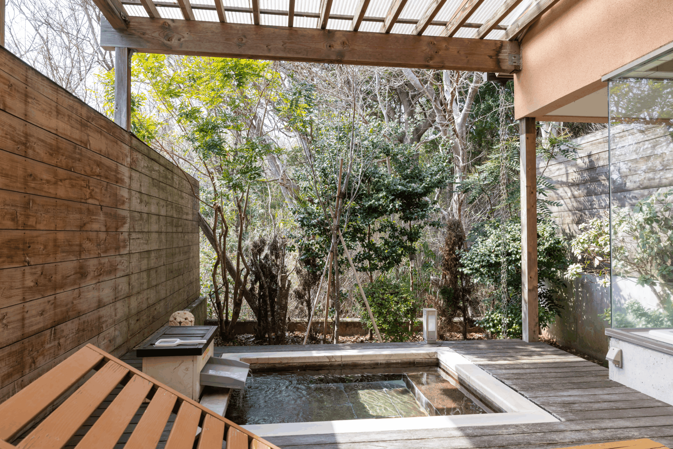 広々とした専用テラスデッキには、開放感あふれる露天風呂と大型ジャグジーを完備。