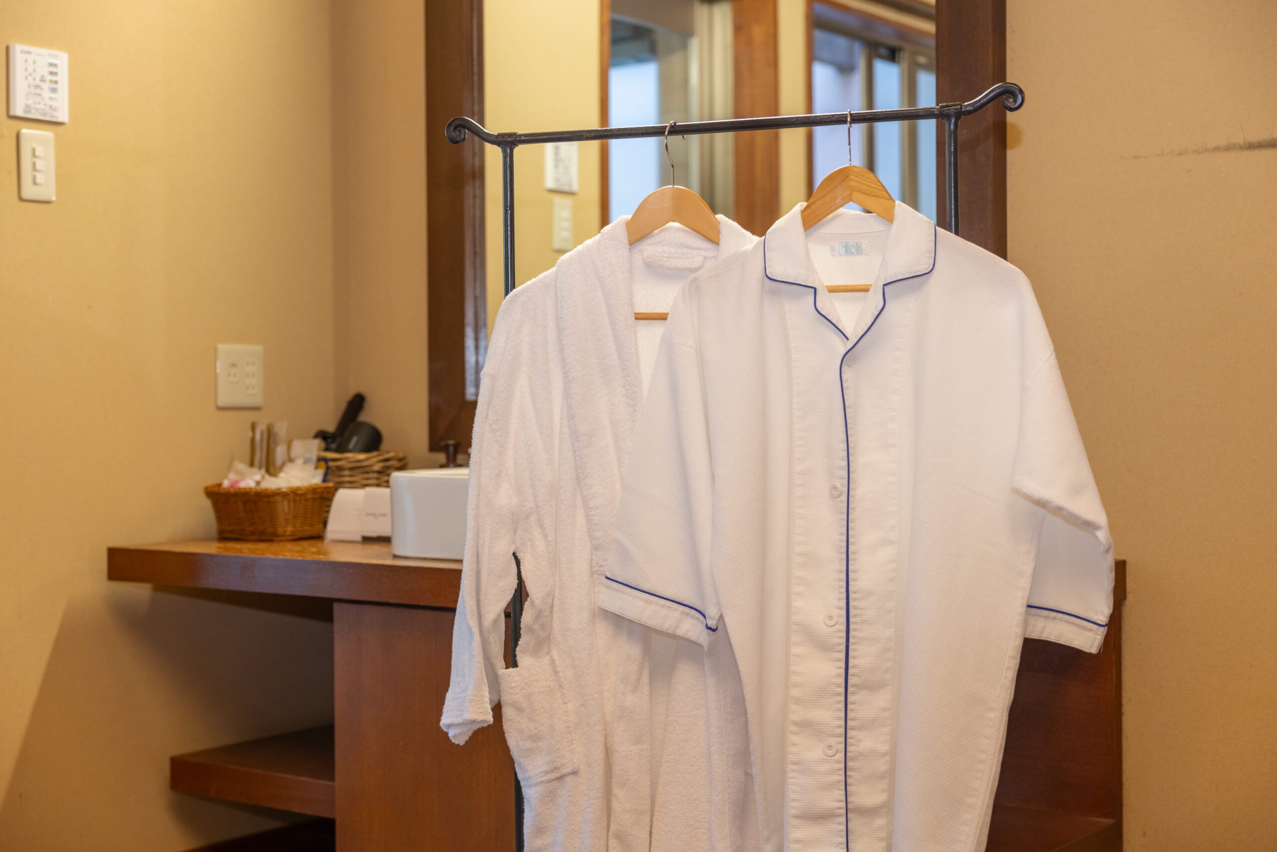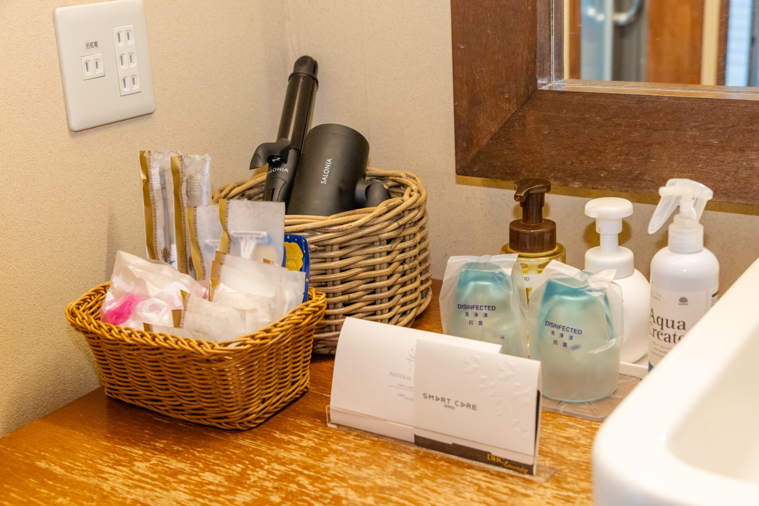 バスローブ / バスタオル / スリッパ / フェイスタオル/ シャンプー / トリートメント / 石鹸 / クレンジングフォーム / 化粧水 / 乳液 / 歯ブラシ / 綿棒 / コットン/ くし / カミソリ / シャワーキャップ